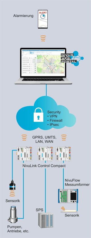 NivuLink Compact ist eine offene und betriebsbereite Lösung zur schnellen Anbindung von Messsystemen an das NIVUS Webportal oder andere übergeordnete Systeme. Damit können Messwerte zentral und schnell erfassbar dargestellt und gespeichert werden.